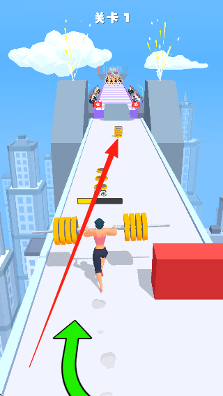 2、操控大力士在跑道上奔跑,收集金幣和道具提升能力,避開重重障礙,朝著關(guān)卡終點(diǎn)穩(wěn)步前進(jìn)。