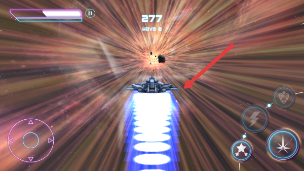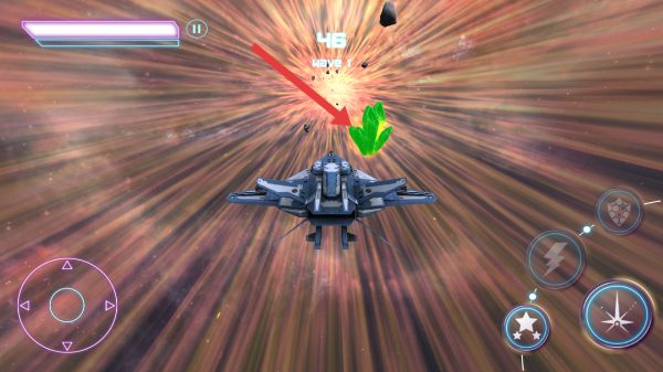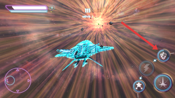 2、收集藍(lán)色的晶體就能夠點(diǎn)擊右側(cè)護(hù)盾圖標(biāo),觸發(fā)藍(lán)色護(hù)盾,抵御隕石攻擊,保障飛船存活。