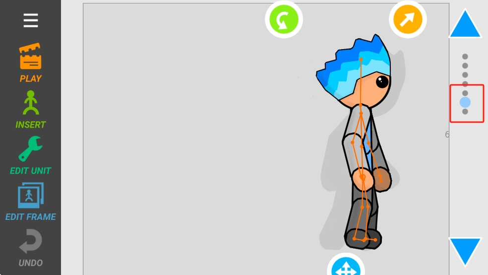 2、右側(cè)點(diǎn)擊藍(lán)色圓點(diǎn)關(guān)鍵幀,記錄當(dāng)前火柴人姿勢(shì),移動(dòng)時(shí)間軸,調(diào)整下一個(gè)關(guān)鍵幀動(dòng)作,讓角色從跳躍回到站立。