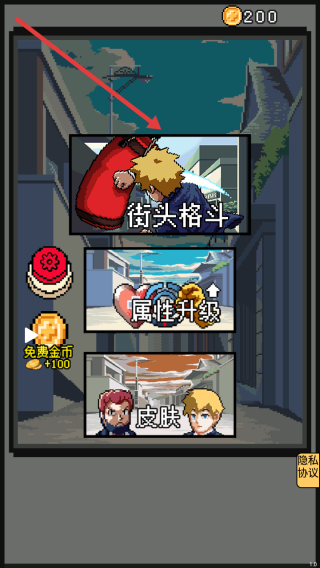 1、主界面選街頭格斗選項(xiàng),點(diǎn)擊進(jìn)入像素風(fēng)格對(duì)戰(zhàn)場(chǎng)景,操控角色直面敵人,正式開(kāi)啟格斗挑戰(zhàn)。