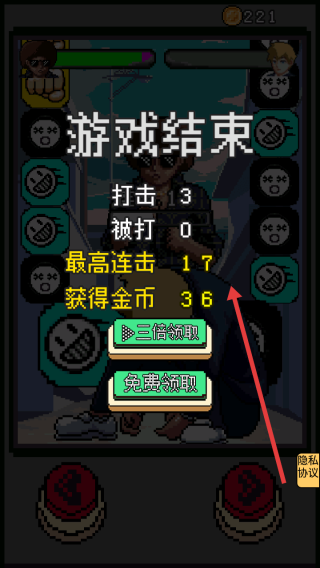 3、戰(zhàn)斗結(jié)束彈出結(jié)算界面,查看打擊、連擊等數(shù)據(jù),點(diǎn)擊免費(fèi)領(lǐng)取獲取金幣,用于屬性升級(jí)或皮膚解鎖,強(qiáng)化角色繼續(xù)挑戰(zhàn)。