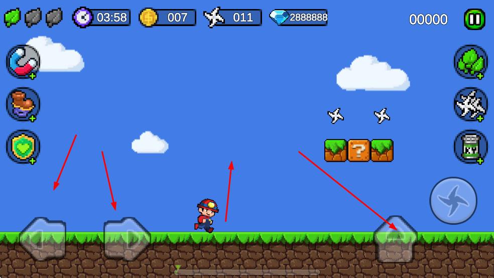 1、操控角色在類似超級(jí)馬里奧風(fēng)格的場(chǎng)景中移動(dòng),可通過左下角的方向按鈕控制角色的左右移動(dòng),右下角的跳躍按鈕控制角色跳躍。
