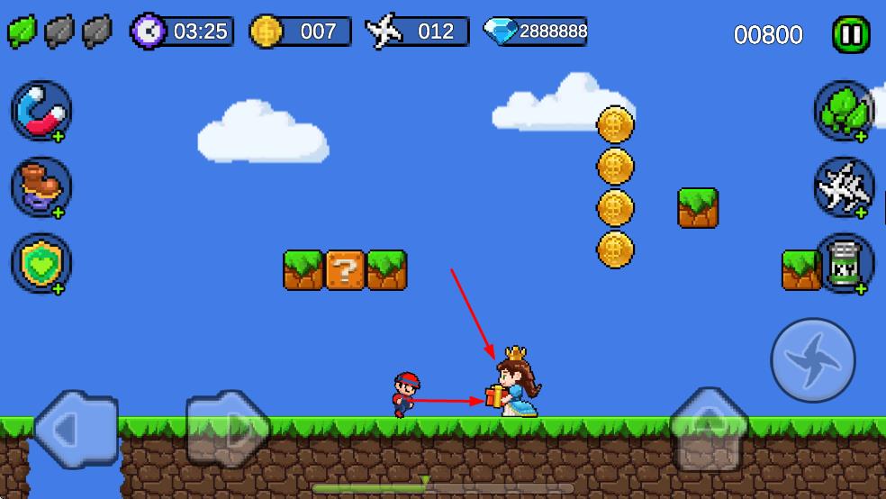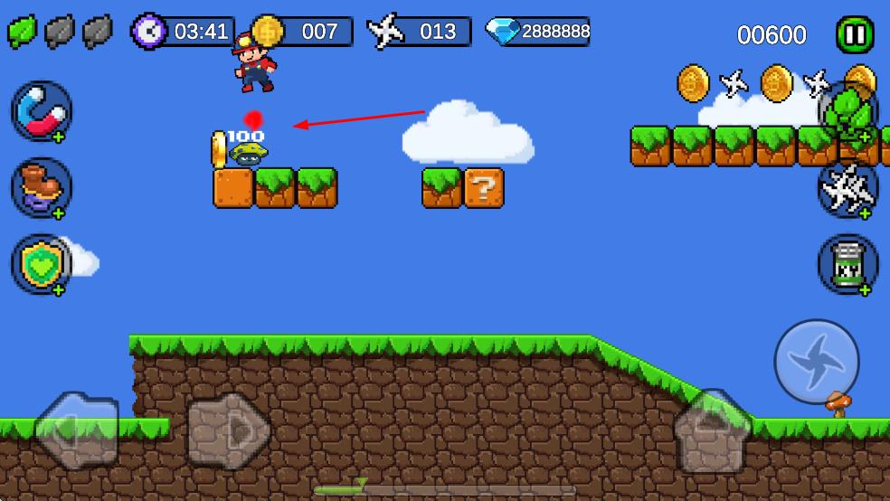 2、角色可以跳躍撞擊帶有?的磚塊,可能會(huì)獲得金幣、道具等獎(jiǎng)勵(lì),同時(shí)還可以收集場(chǎng)景中的金幣、飛機(jī)等物品來增加分?jǐn)?shù)和資源。
