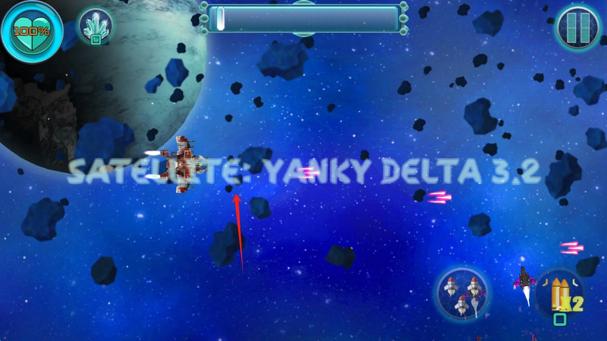 3、游戲中操控飛船,在太空中射擊敵人,躲避隕石,關注衛(wèi)星信息,合理利用道具,完成關卡任務。
