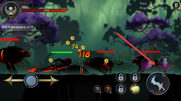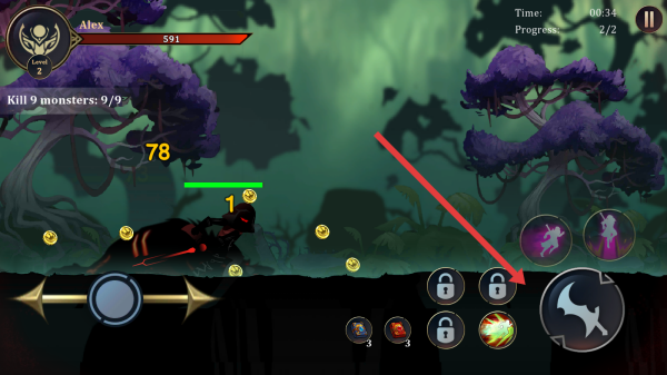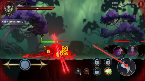 2、砍死怪物后掉金幣別漏撿,攢夠開技能右側(cè)紫色圖標(biāo),被圍時放技能清場,需要留意血量上方的紅條。