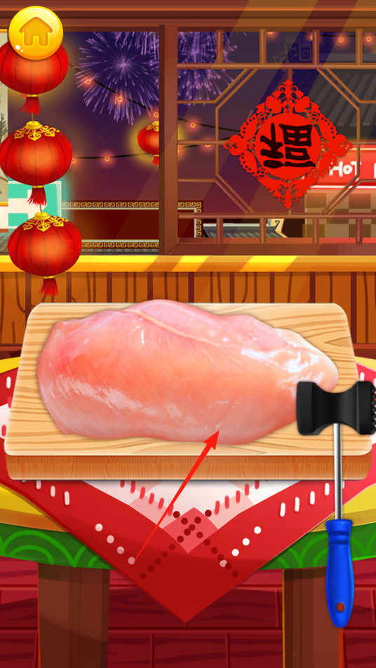 1、點(diǎn)擊肉和錘子開(kāi)始捶打雞肉,通過(guò)反復(fù)敲擊讓雞肉質(zhì)地改變,為后續(xù)烹飪做準(zhǔn)備,體驗(yàn)食材預(yù)處理機(jī)制。