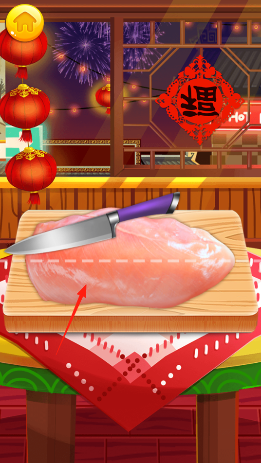 2、使用刀具沿虛線切割雞肉,將整塊肉分成合適大小,滿足烹飪需求學(xué)習(xí)切割技巧,體驗(yàn)食材分割玩法。