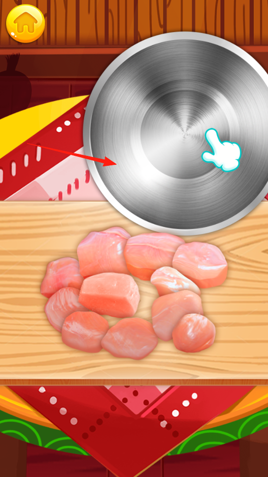 3、拖動(dòng)雞肉塊放入上方的鍋中,完成食材投放,開(kāi)啟烹飪流程,將預(yù)處理的雞肉制作成菜肴,體驗(yàn)烹飪啟動(dòng)機(jī)制。