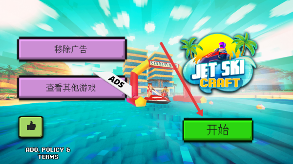 1、在JET-SKI-CRAFT游戲初始界面,根據(jù)箭頭指示,點(diǎn)擊綠色開始按鈕,進(jìn)入游戲游玩環(huán)節(jié)。