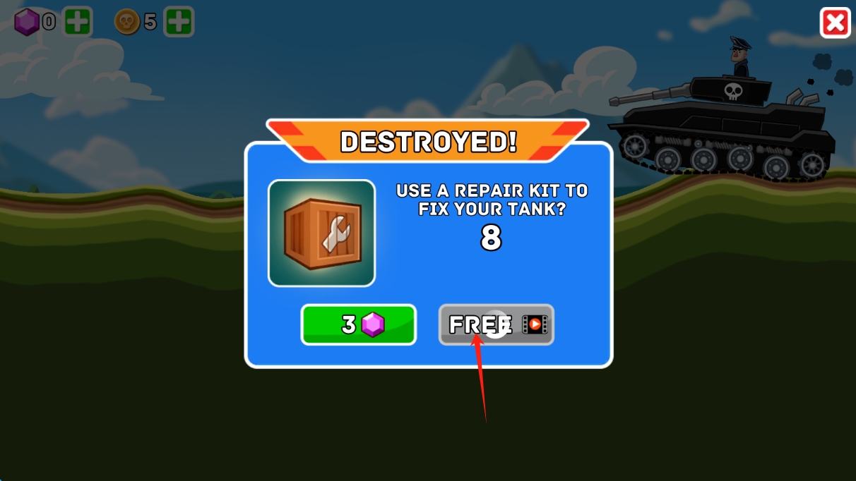 3、當(dāng)坦克被摧毀時(shí),可選擇使用3個(gè)紫色寶石或觀看廣告免費(fèi)獲得修理工具來修復(fù)坦克,繼續(xù)游戲。