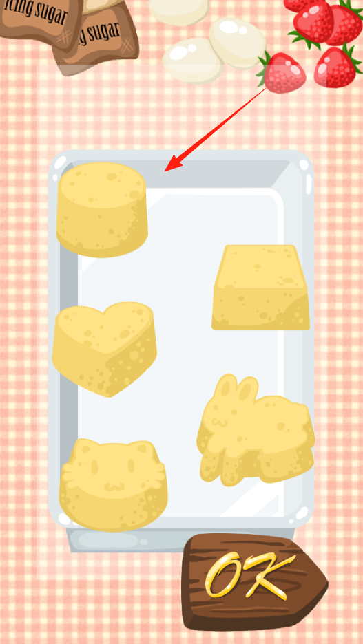 2、挑選蛋糕胚放入烤盤,準(zhǔn)備烘焙,點(diǎn)擊OK推進(jìn)制作步驟,體驗(yàn)基礎(chǔ)烘焙玩法。