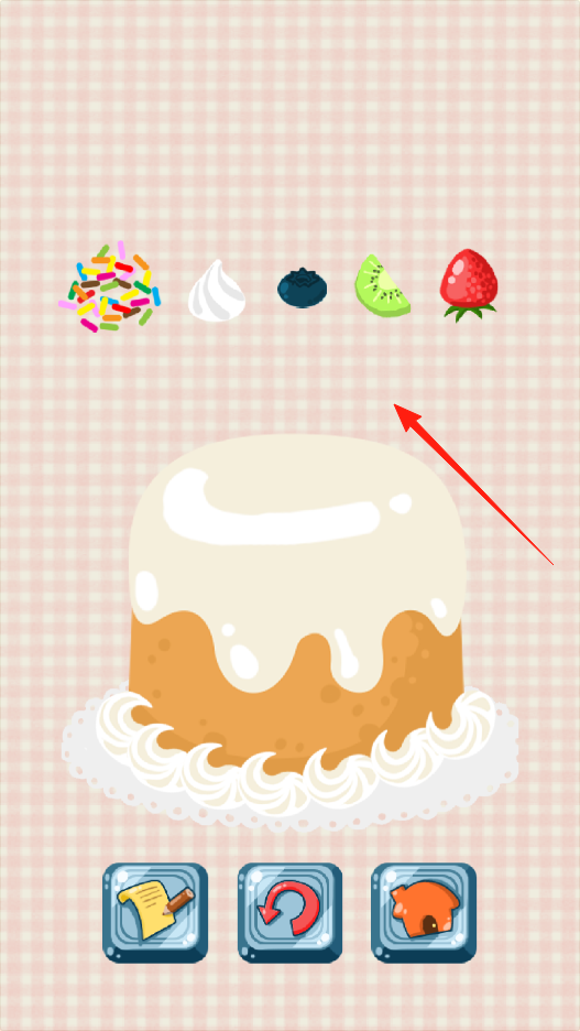 3、拖動(dòng)裝飾,布置蛋糕,添加水果糖屑,設(shè)計(jì)外觀完成創(chuàng)意裝飾,體驗(yàn)甜品裝飾機(jī)制。