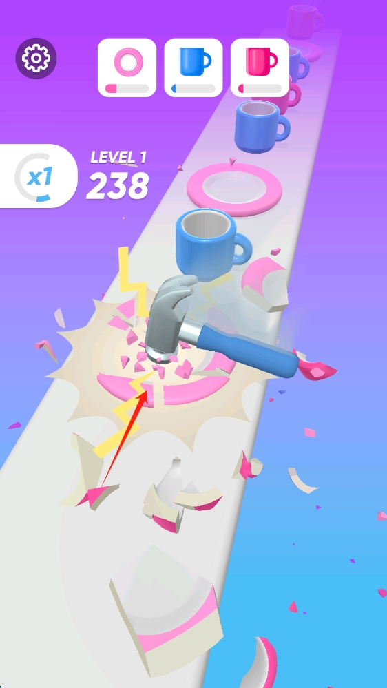 2、游戲中,操控錘子,瞄準(zhǔn)物品,精準(zhǔn)擊碎,注意關(guān)卡要求,積累分?jǐn)?shù),點(diǎn)擊錘盤子。