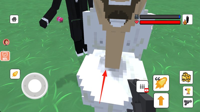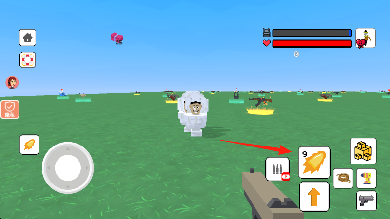 3、遇敵人時,右側(cè)切換武器,點擊射擊按鈕攻擊,利用地形走位,積累擊殺解鎖新武器、皮膚,推進(jìn)沙盒冒險。