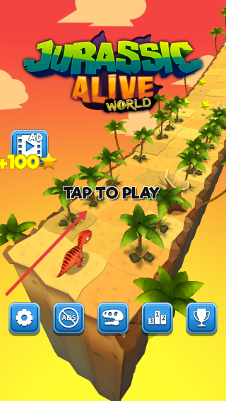 1、主界面找到TAP TO PLAY按鈕,點擊進(jìn)入恐龍跑酷場景,操控小恐龍?zhí)ど蠞M是棕櫚樹與陷阱的冒險路徑。