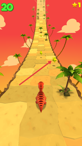 2、跑酷時緊盯路徑,引導(dǎo)恐龍左右移動、跳躍避開懸崖與石塊,優(yōu)先收集黃色星星,借連續(xù)收集延長奔跑時長積累分?jǐn)?shù)。