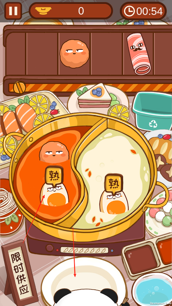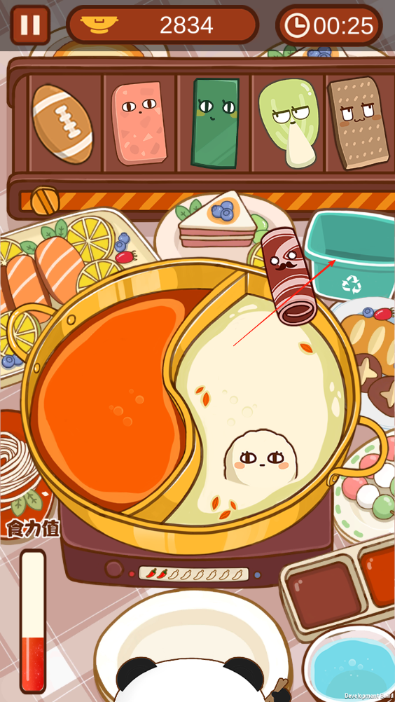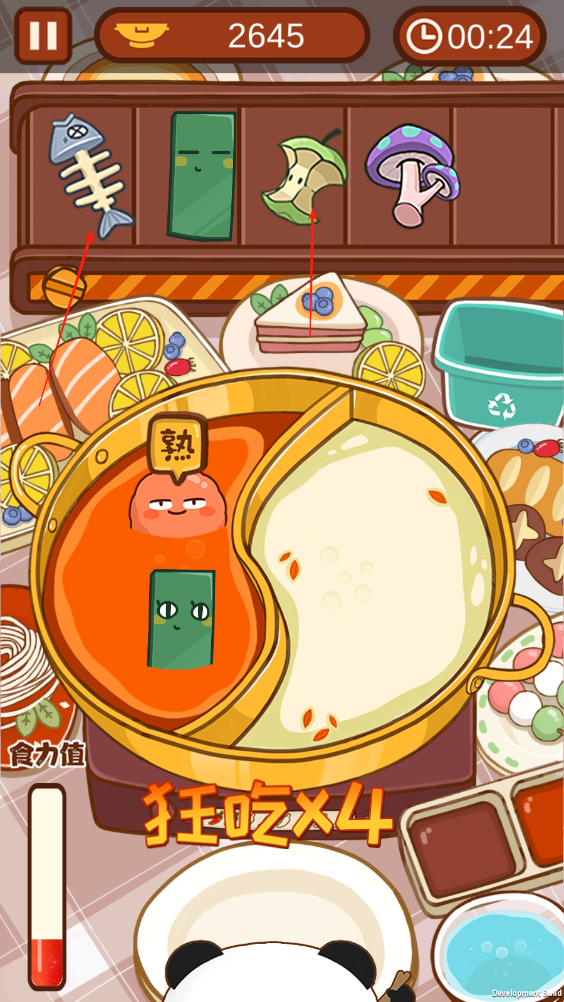 1、上方的傳送帶會(huì)不斷傳送食物,我們需要將食物拖動(dòng)進(jìn)鍋里,當(dāng)食物上方出現(xiàn)熟字時(shí),即可拖動(dòng)食物到盤子里讓小熊貓吃下。