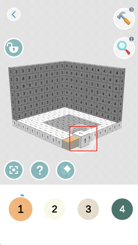 1、觀察3D方塊數(shù)字布局,拖動(dòng)標(biāo)注1的方塊,依據(jù)周圍數(shù)字提示,嵌入對(duì)應(yīng)位置,逐步拼接方塊結(jié)構(gòu),完成初始拼圖搭建。