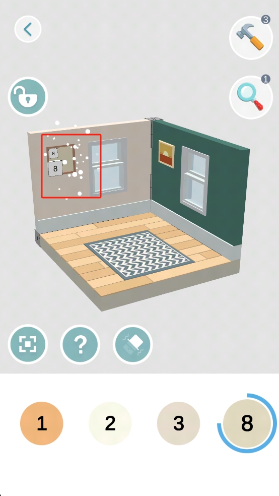 2、找到標(biāo)有數(shù)字8的墻上門牌,結(jié)合下方數(shù)字8的道具,點(diǎn)擊互動(dòng),解鎖房間隱藏內(nèi)容,推進(jìn)解謎。