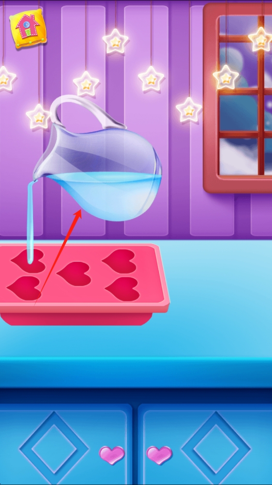 3、將液體小心倒入心形模具,按照步驟操作,完成奶昔制作的關(guān)鍵環(huán)節(jié),點(diǎn)擊倒水。