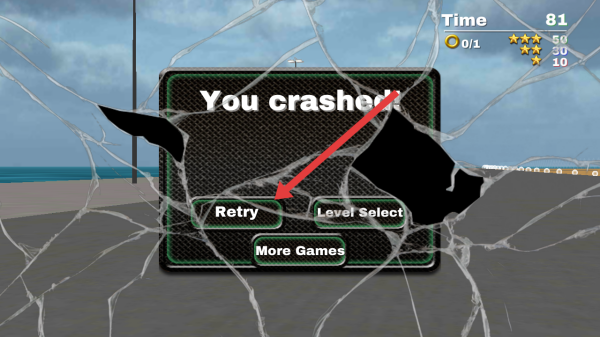 2、如果沒控制好速度和方向的話,飛機很容易墜毀,需要點擊Retry的按鈕,重新挑戰(zhàn)當(dāng)前關(guān)卡。