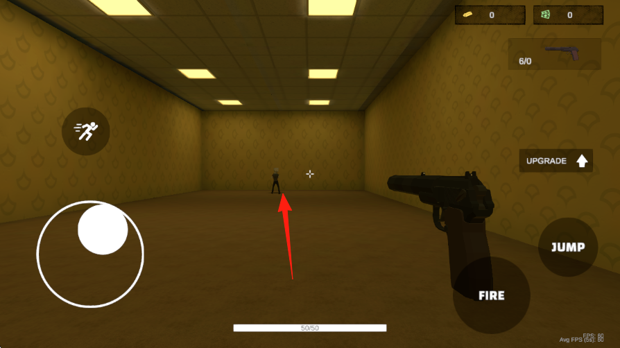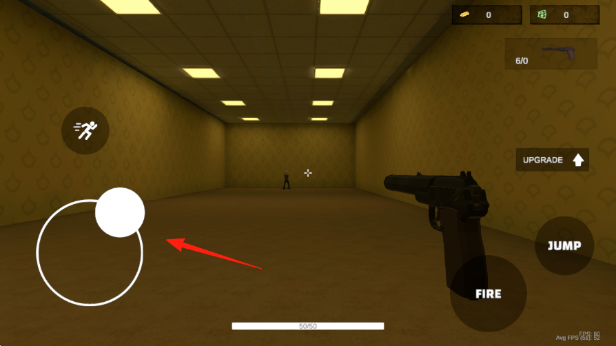 1、左搖桿前后左右滑動(dòng),操控角色在房間移動(dòng),靠近敵方角色紅箭頭指引方向,熟悉搖桿靈敏度。