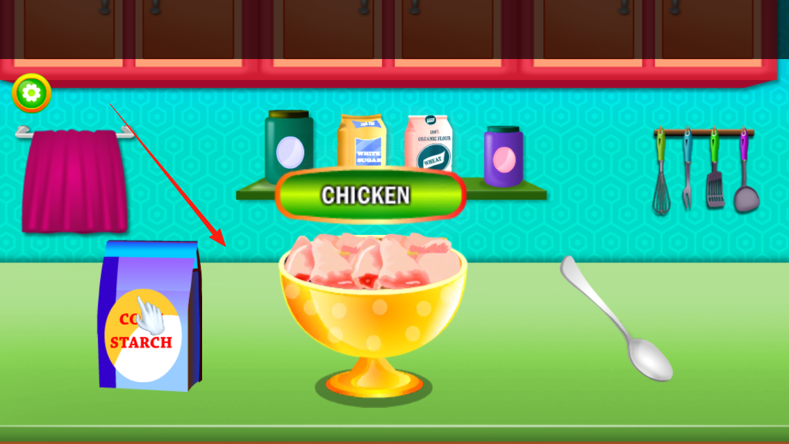 1、點(diǎn)擊淀粉袋準(zhǔn)備食材,將淀粉與雞肉搭配,開(kāi)啟烹飪前期準(zhǔn)備,推進(jìn)做菜流程。