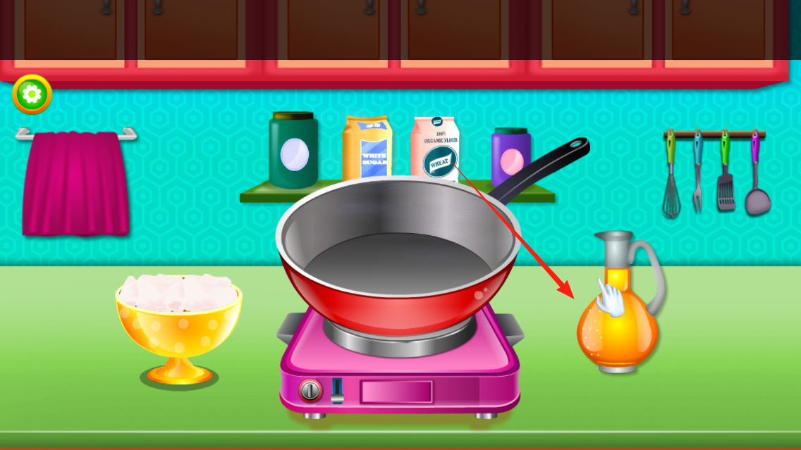 2、拖動(dòng)油壺倒入鍋中,在炒鍋內(nèi)加入食用油,為烹飪雞肉打底,體驗(yàn)熱油步驟。