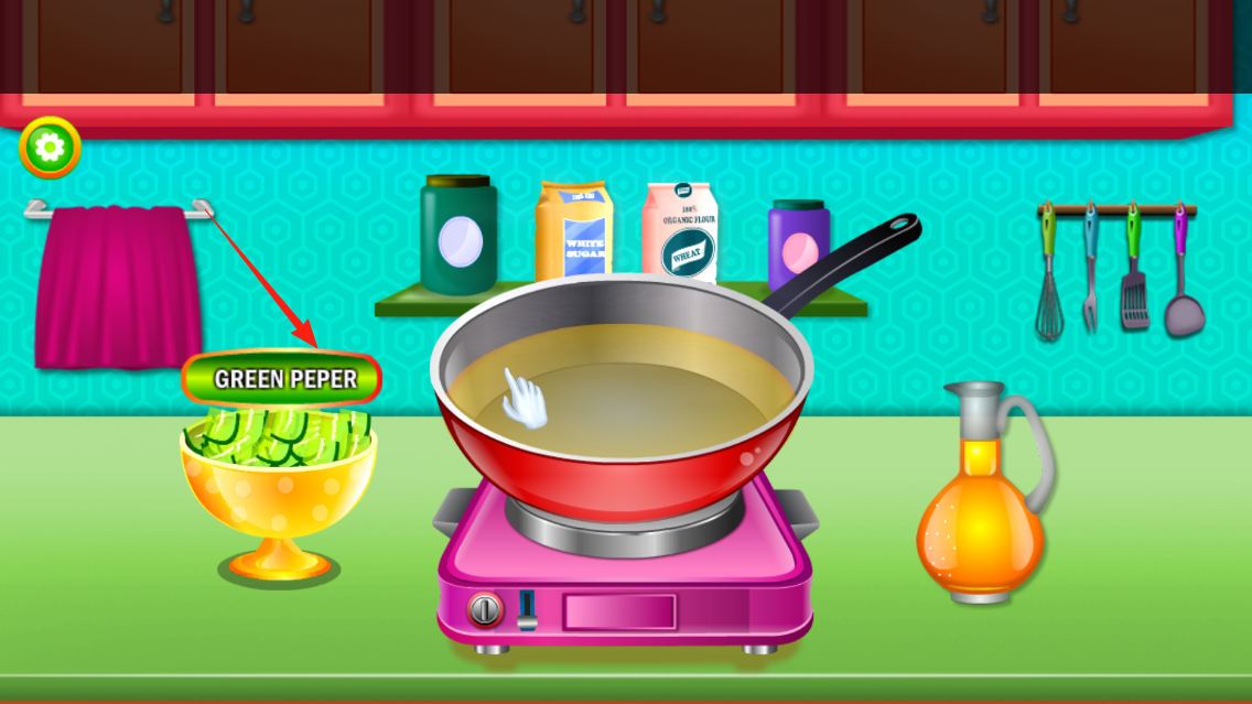 3、點(diǎn)擊青椒碗放入鍋中,將青椒投入熱油,與后續(xù)食材翻炒,豐富菜品配料。