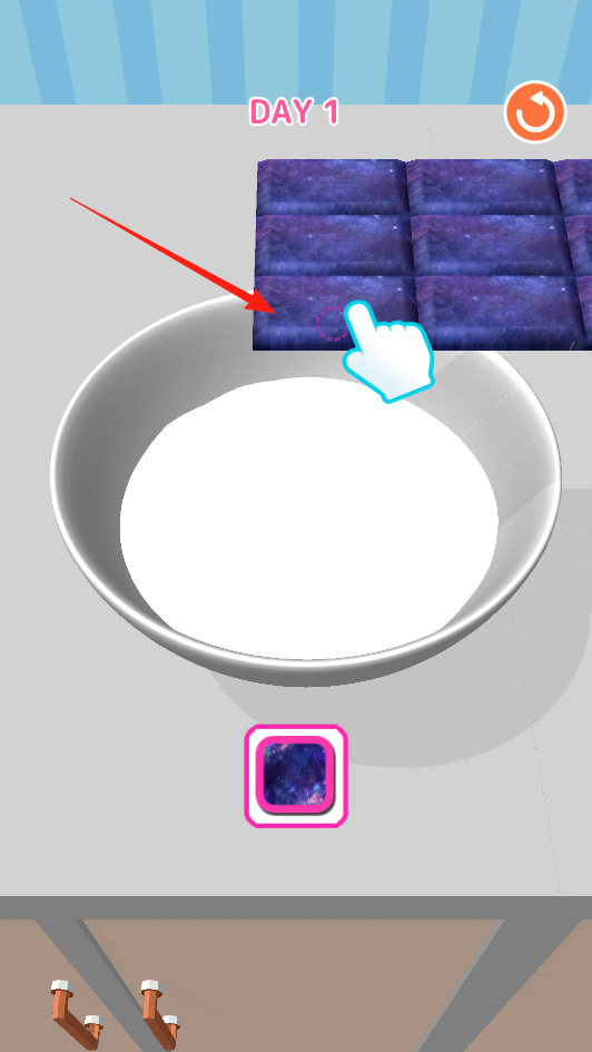 1、點(diǎn)擊紫色方塊放入碗中,按照指引添加材料,開啟制作流程,體驗(yàn)材料組合機(jī)制。