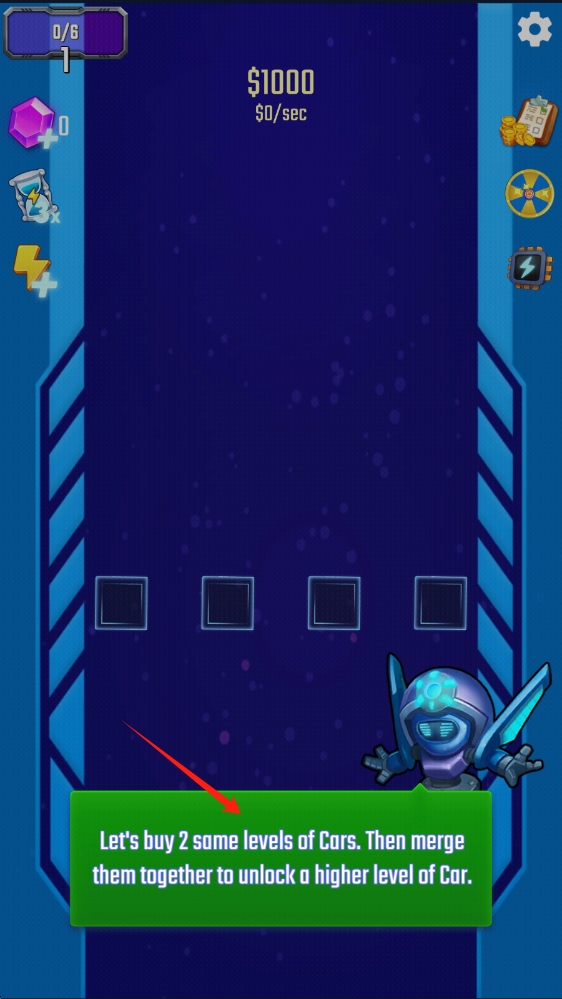 1、在游戲中,按照提示,購買兩輛同等級的汽車,進行合并操作,解鎖更高級別的汽車,增強自身實力。