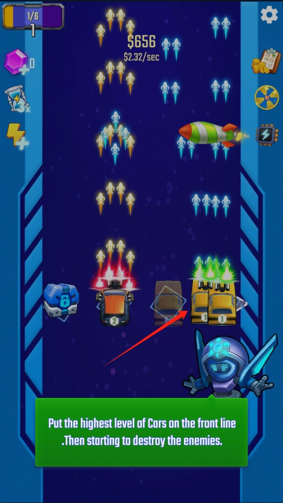 3、根據提示,將最高等級的汽車放置在前線位置,充分發(fā)揮其強大戰(zhàn)力,有效消滅敵人,推進游戲進程。