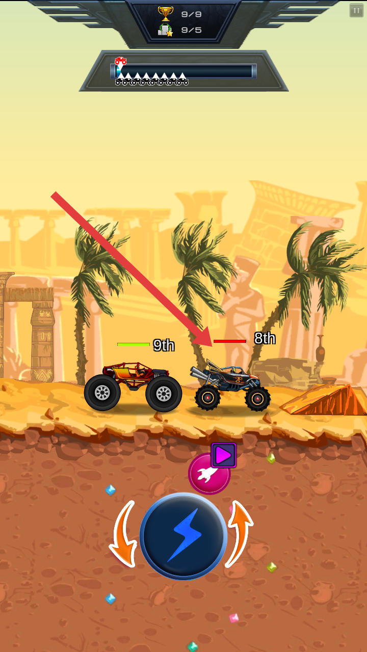 1、開局操控賽車處在賽場的9th,可以點擊底部閃電按鈕觸發(fā)加速,嘗試超越前方黑色卡車8th。