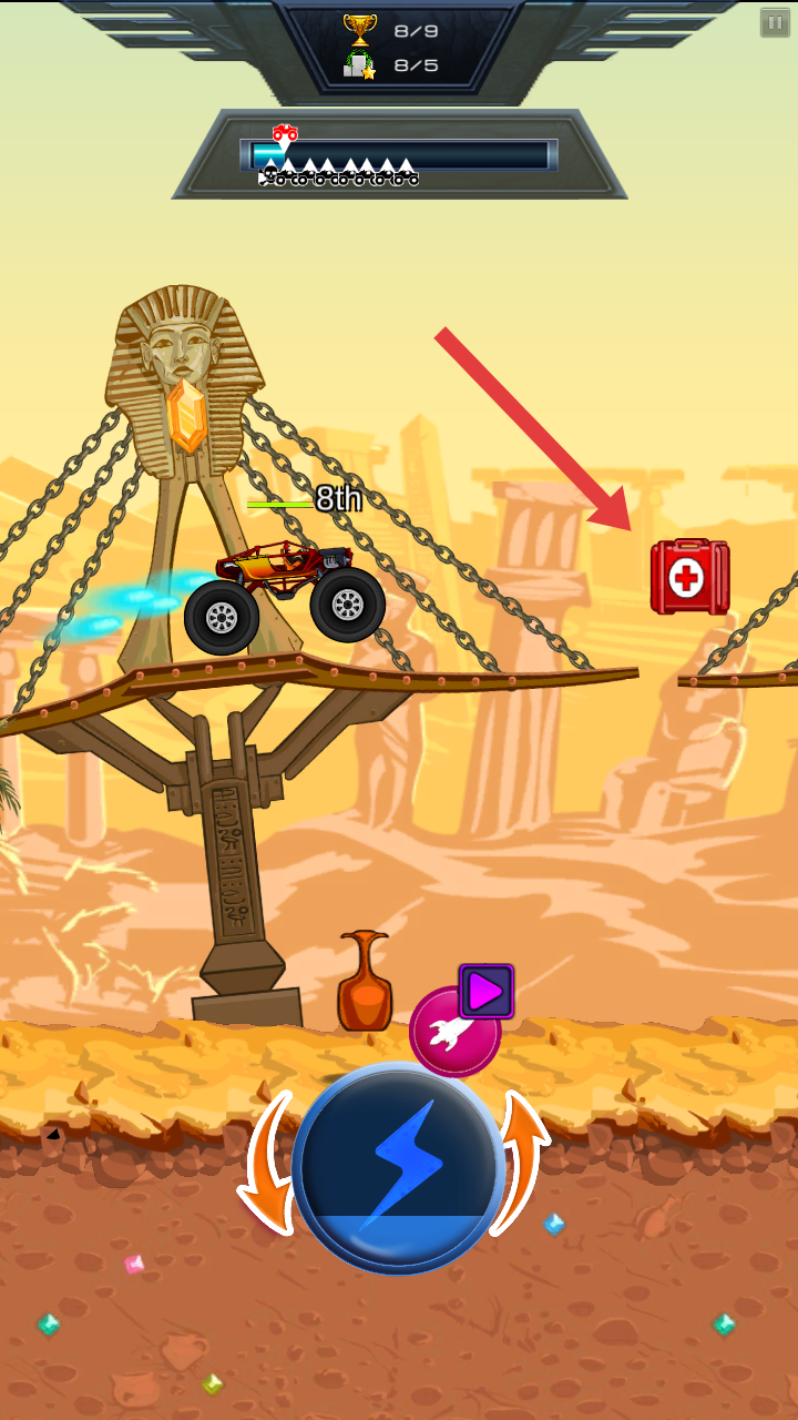 2、行駛至Sphinx雕像旁的紅色急救箱區(qū)域,優(yōu)先收集道具恢復車輛的血量,來提升自身的續(xù)航能力。