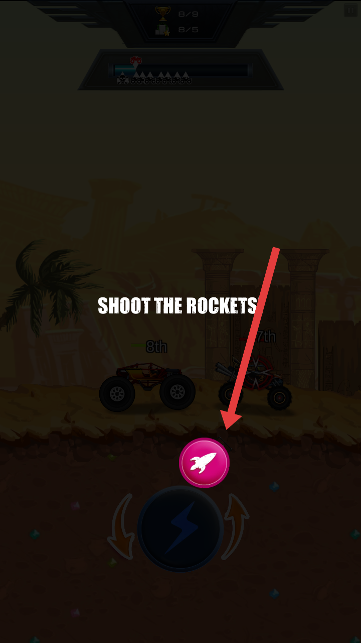 3、當界面提示SHOOT THE ROCKETS時,點擊粉色火箭按鈕,向對手發(fā)射火箭,干擾它行駛。