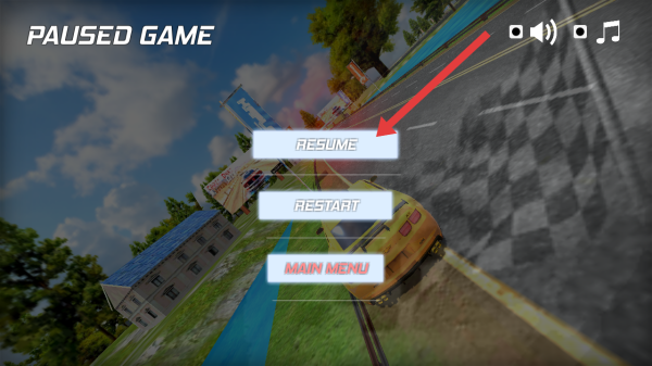 3、若是暫停了游戲,可以點(diǎn)擊界面中RESUME按鈕,恢復(fù)賽車(chē)比賽進(jìn)程,繼續(xù)完成競(jìng)速的挑戰(zhàn)。