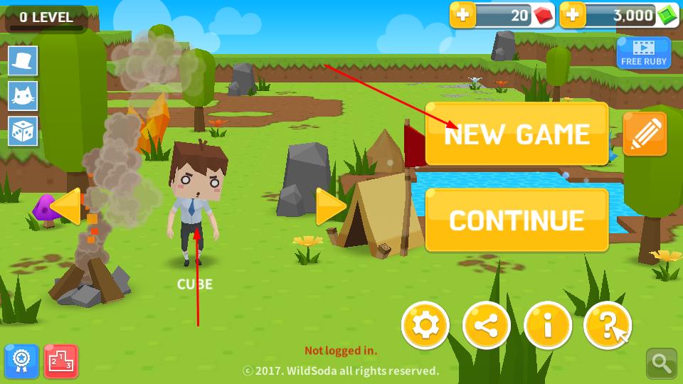 1、點擊黃色NEW GAME按鈕開啟全新冒險,或選CONTINUE延續(xù)進(jìn)度,操控立方造型角色踏入草地場景,開啟生存挑戰(zhàn)流程。