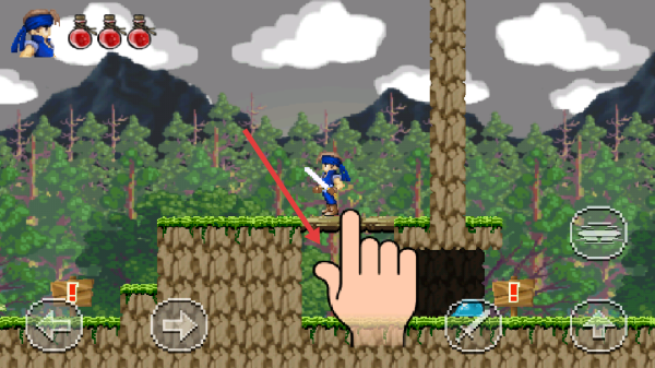 2、森林場(chǎng)景有山、樹、懸崖,按指引長(zhǎng)按屏幕讓角色跳躍,跨越草皮覆蓋的斷層,繼續(xù)推進(jìn)Level1探索。
