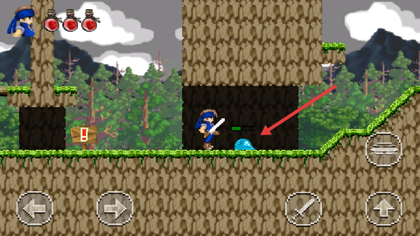 3、前行遇藍(lán)色史萊姆敵人,點(diǎn)擊攻擊鍵或自動(dòng)攻擊,用劍消滅怪物,沿綠草路徑向更深處關(guān)卡推進(jìn)。