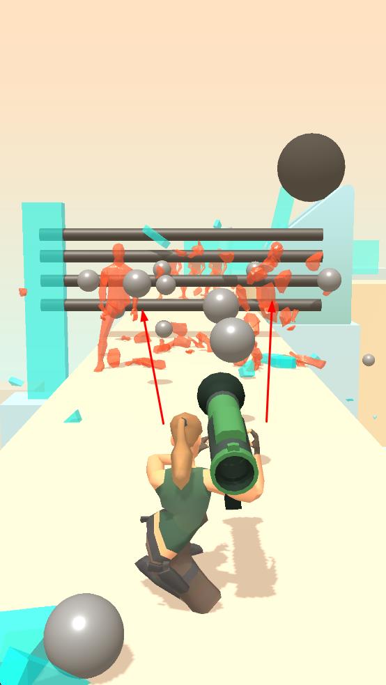 1、操控持炮角色沿路徑前進(jìn),瞄準(zhǔn)前方灰色球體與紅色敵人,利用炮彈摧毀障礙。