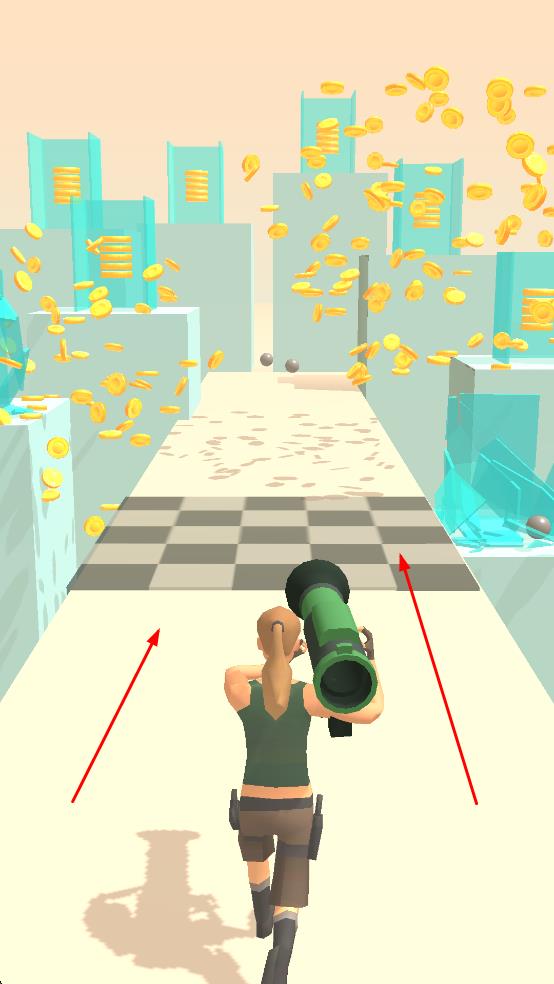 2、通過射擊擊碎欄桿與敵人,清除路徑阻礙,同時(shí)收集散落的金幣,積累游戲收益。