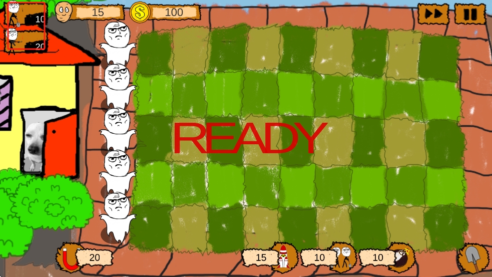 1、開局READY階段,消耗金幣從左側(cè)選擇兵種,拖放至草坪方格布置防線,準(zhǔn)備抵御幽靈敵人進(jìn)攻。