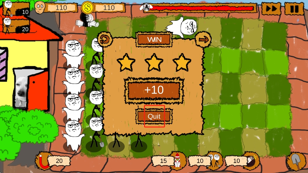 3、成功擊退所有敵人后,界面呈現(xiàn)三星勝利與+10分?jǐn)?shù)的獎(jiǎng)勵(lì),點(diǎn)擊紅色框內(nèi)的Quit按鈕,結(jié)束本關(guān)并籌備下一挑戰(zhàn)。