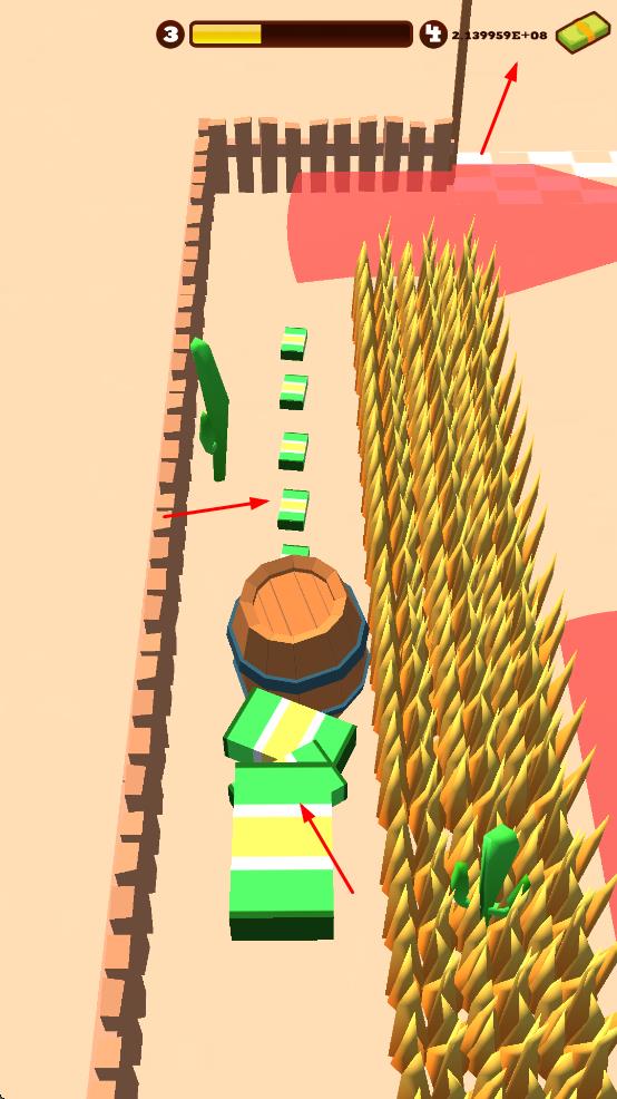 2、靠近綠色方塊進行收集,積累方塊數(shù)量推進關(guān)卡進度,同時繞過黃色草叢等障礙區(qū)域,規(guī)劃安全路徑。
