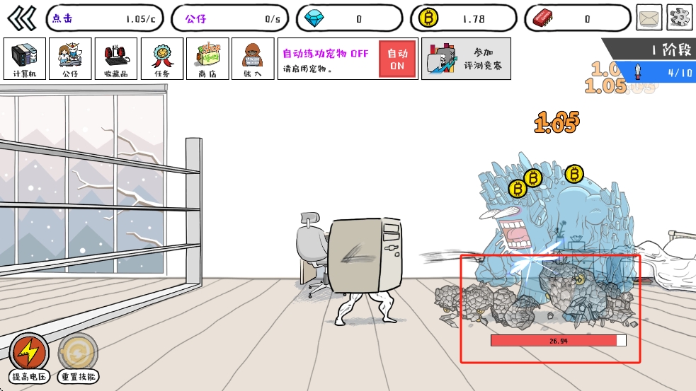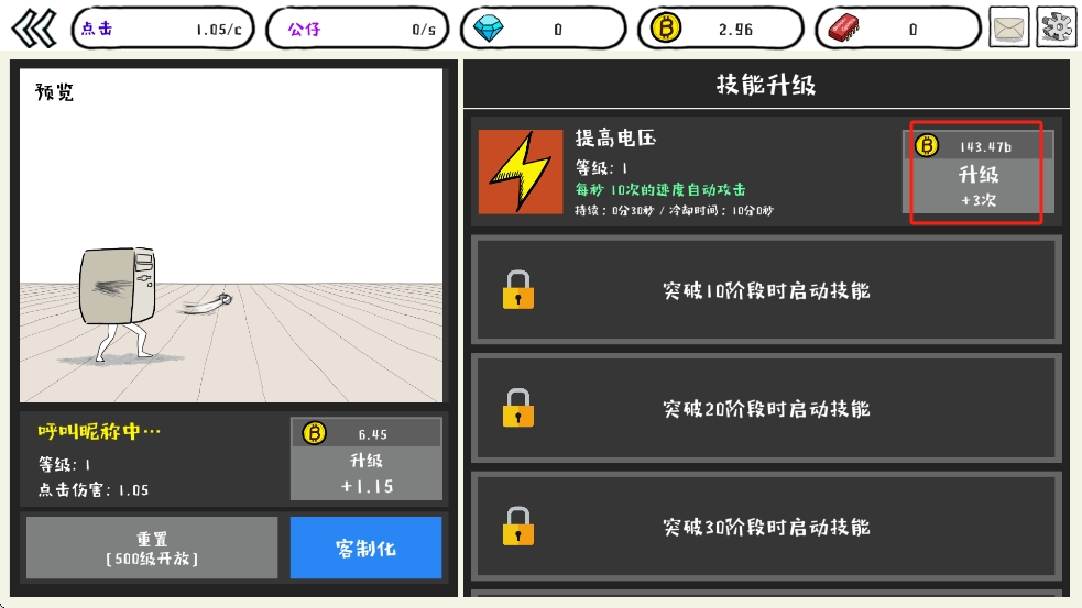 3、進入技能界面,消耗金幣點擊提高電壓旁的升級按鈕,提升每秒攻擊次數(shù),強化輸出備戰(zhàn)后續(xù)。