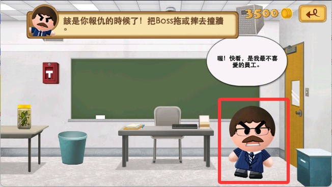 1、進(jìn)入游戲后拖或摔老板去撞墻報(bào)仇。