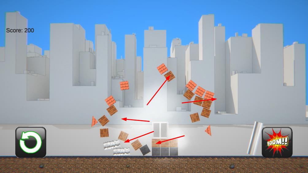 3、爆炸后,觀察建筑的破壞效果,獲取相應(yīng)分數(shù),若需重新挑戰(zhàn),可點擊左側(cè)重置按鈕重新開始。