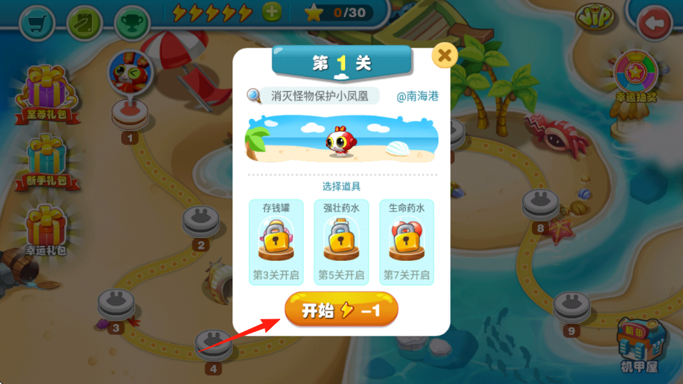 1、在關(guān)卡選擇界面第1關(guān),點(diǎn)擊開(kāi)始,進(jìn)入南海港場(chǎng)景,目標(biāo)消滅怪物保護(hù)小鳳凰,可選道具需解鎖,直接開(kāi)始戰(zhàn)斗。