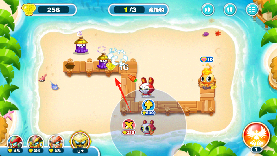 2、戰(zhàn)斗中,沙灘地圖,紅箭頭指向紫色怪物,點(diǎn)擊下方精靈如兔子,消耗金幣出戰(zhàn),攻擊怪物,注意波次,合理分配精靈。