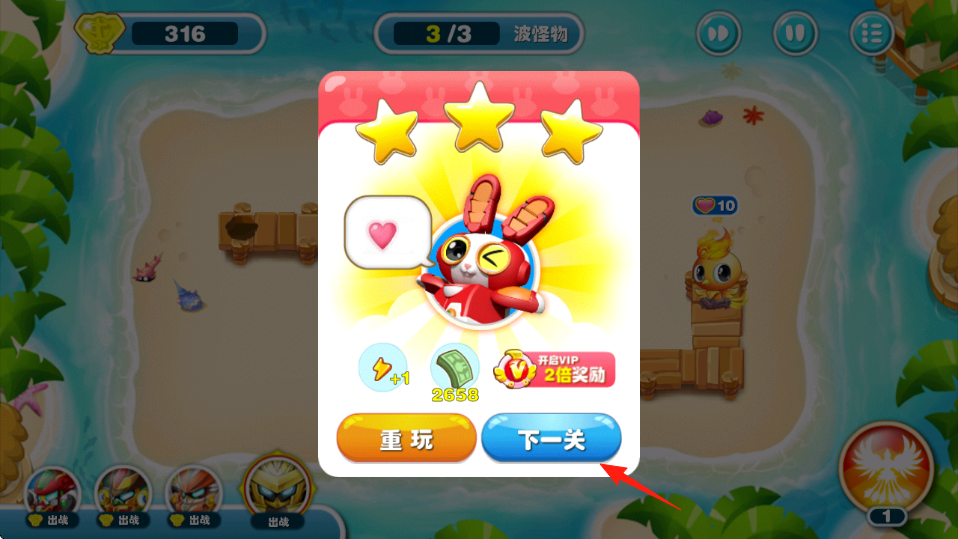 3、完成3波怪物,獲三星評(píng)價(jià),點(diǎn)擊下一關(guān),獲取獎(jiǎng)勵(lì),解鎖新精靈、關(guān)卡,繼續(xù)挑戰(zhàn),提升精靈等級(jí)、技能,優(yōu)化戰(zhàn)斗策略。
